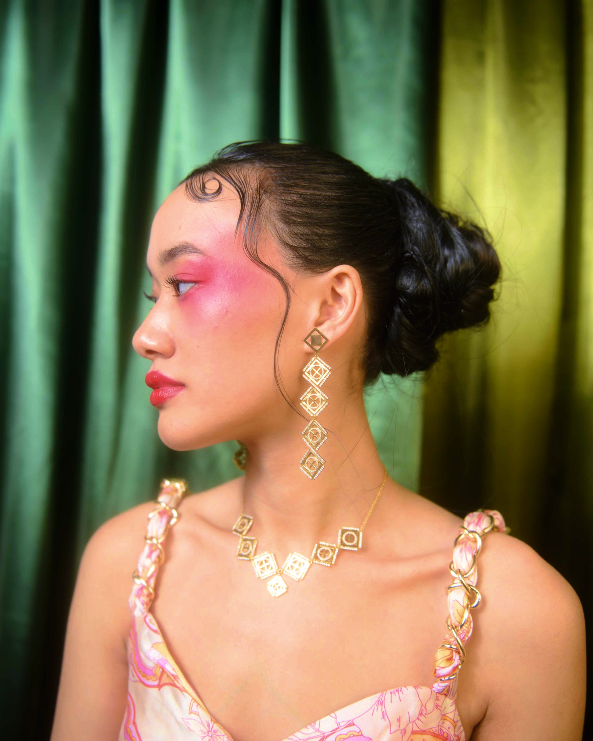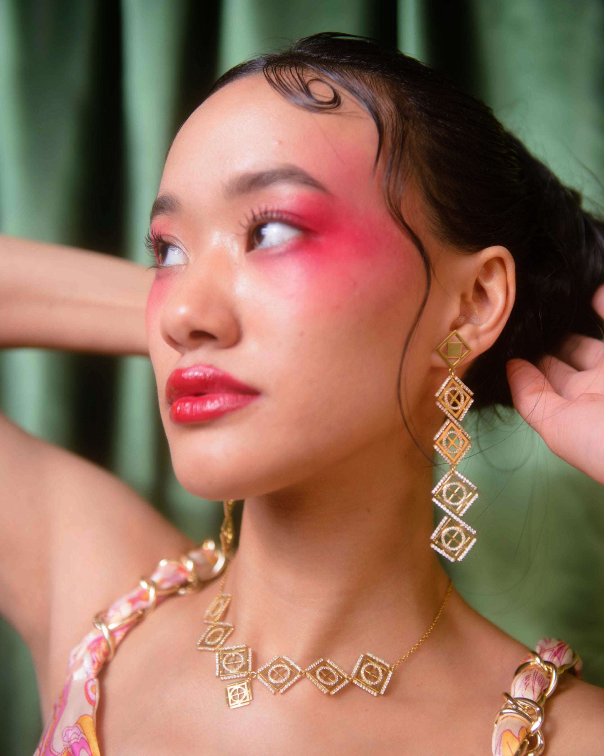This piece is inspired by the mandala art in buddhism. The geometric aesthetics of mandala is infused in this piece of jewellery. The angular shape gives it a modern touch and is studded by top quality cubic zirconia